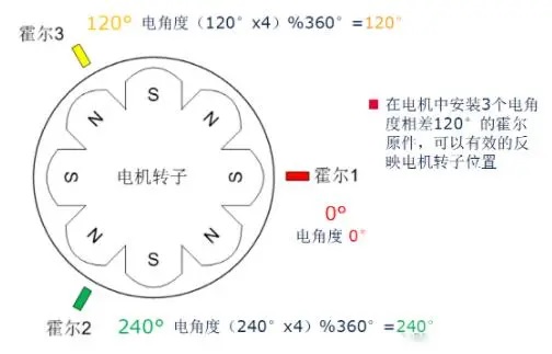 對于BLDC有感控制,要求BLDC電機(jī)本身裝有霍爾傳感器,電機(jī)霍爾傳感器安裝時需要相差120°,如下圖所示。