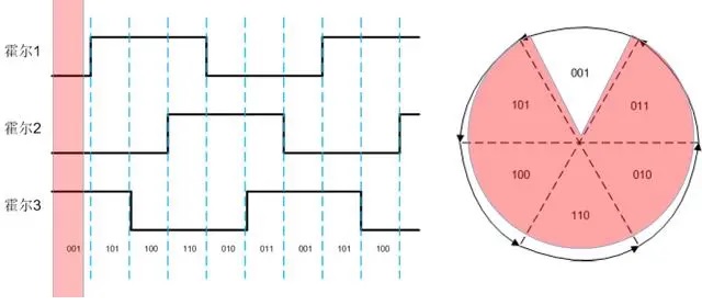 電機(jī)按一定方向轉(zhuǎn)動時,3個霍爾的輸出會按照6步的規(guī)律變化如下: