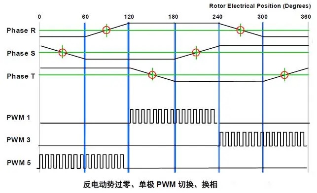 基于反電動勢感應(yīng)的技術(shù):基于反電動勢過零來進(jìn)行換相;要求反電動勢足夠高,速度范圍在額定轉(zhuǎn)速的5-10%至100%。