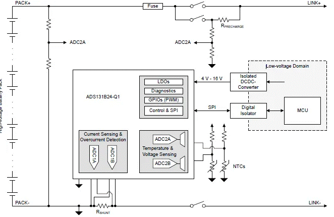 德州儀器(TI)ADS131B24-Q1是一款可用于電動(dòng)汽車HVBMS的電壓、電流和溫度檢測(cè)的產(chǎn)品,有很高的集成度,包括:兩個(gè)同步采樣、高精度的24位ADC 通道(ADC1A、ADC1B),可使用外部分流電阻以高分辨率和高精度測(cè)量電池電流;兩個(gè)獨(dú)立的數(shù)字比較器,可與兩個(gè)ADC并聯(lián)來實(shí)現(xiàn)快速過流檢測(cè);還集成了兩個(gè)多路復(fù)用的16位ADC通道(ADC2A、ADC2B),可使用外部高壓電阻分壓器來測(cè)量分流器溫度和系統(tǒng)中的其它電壓,例如電池組電壓。分流器溫度通過熱敏電阻或模擬輸出溫度傳感器等外部溫度傳感器進(jìn)行測(cè)量。