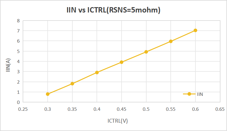 其中,Rsns1單位為毫歐(mohm)。當(dāng)RSNS1=5mohm時,輸入電流IIN與ICTRL電壓關(guān)系測試結(jié)果如圖3所示: