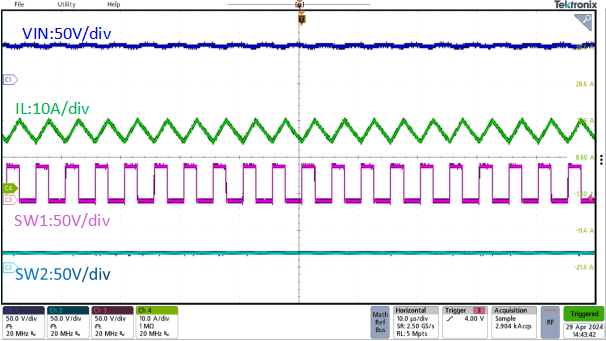 圖5. 800W, Vin=10~60V, Vout=20-55V滿電流條件下穩(wěn)態(tài)波形