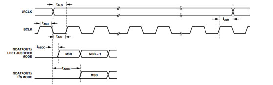 • MCLK:主時(shí)鐘。嚴(yán)格意義上, MCLK 不歸屬于這個(gè)協(xié)議范圍之內(nèi),因?yàn)槠骷膯佣夹枰鲿r(shí)鐘的輸入,同時(shí)我們的 BCLK 基本上是從 MCLK 分頻或者倍頻而得到的,所以在常見的不帶晶振的 AD、DA 芯片中,需要這么一個(gè)輸入。例如 ADI 的 ADAU197X 系列,如果有的器件不需要 MCLKIN,那么一般是以 BCLK 作為了時(shí)鐘的主導(dǎo)。