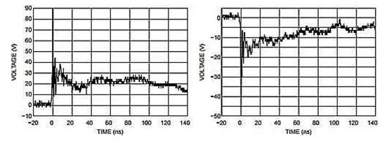 圖 1:ESD7008 對(duì) IEC61000-4-2 +/-8kV 接觸 ESD 脈沖的鉗位響應(yīng)(來源:ON Semi)