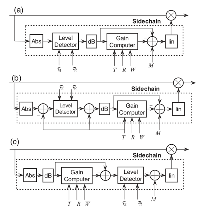 一般DRC包含分頻,擴(kuò)位,峰值/均值檢測(cè),啟動(dòng)和釋放平滑增益控制等,常見動(dòng)態(tài)范圍壓縮的框圖如下。
