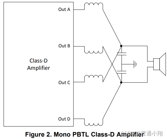 并聯(lián)橋接負(fù)載(PBTL)是一種輸出配置,它采用立體聲BTL放大器,并將輸出并聯(lián)為單聲道。PBTL和BTL的負(fù)載兩端電壓相同,但由于每個(gè)輸出負(fù)載電流翻倍,因此最大電流已經(jīng)增加。由P = UI 得,PBTL功率為BTL的2倍。