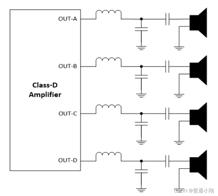 橋接負(fù)載(Bridge-tied load, BTL)是D類放大器最常見(jiàn)的輸出配置。BTL配置由一個(gè)放大器驅(qū)動(dòng)負(fù)載的一側(cè)OutA ,另一個(gè)放大器從第一個(gè)放大器得到反向信號(hào)OutB,驅(qū)動(dòng)負(fù)載的另一側(cè)。相比于單端(SE)電壓相當(dāng)于翻倍,功率P = V*V/R,所以功率最大可以做到相當(dāng)于單端的4倍。