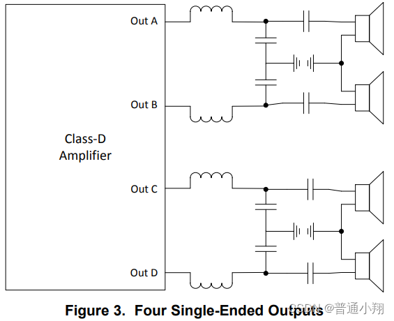 單端(SE)配置中,只使用一個(gè)輸出來(lái)驅(qū)動(dòng)負(fù)載,而不是像BTL和PBTL配置中那樣使用一對(duì)相位不同的輸出。但是,這種配置可以使用單個(gè)立體聲BTL放大器實(shí)現(xiàn),如下圖所示。一些放大器還允許組合1× BTL和2× SE通道,以支持單個(gè)設(shè)備的2.1音頻系統(tǒng)。