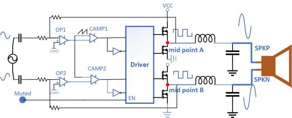 Class D功率放大器輸出與輸入音頻信號相對應的脈沖,A點和B點的脈沖由半橋開關產(chǎn)生。低通濾波器由電感和電容組成,為從這些高頻脈沖中解調出的音頻信號提供路徑,解調后的音頻信號通過揚聲器,將電能轉換為聲能,然后被人的耳朵聽到。如果用戶在開始播放音樂或計劃停止音樂時總是聽到爆裂聲或點擊聲,這將是非常糟糕的體驗。