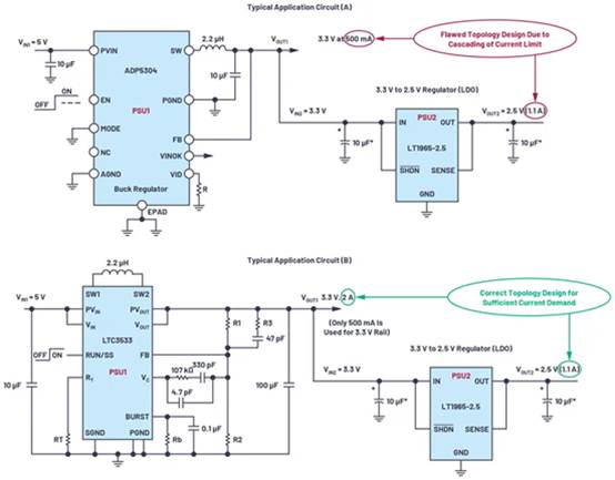 退出級聯(lián)階段時,要避免限流情況。圖2所示為一個典型的級聯(lián)應(yīng)用:(A) 顯示由產(chǎn)生3.3 V電源,電流最大500 mA的ADP5304 降壓穩(wěn)壓器(PSU1)構(gòu)成的設(shè)計(jì)。為了提高效率,設(shè)計(jì)人員應(yīng)分接3.3 V電軌,而不是5 V輸入電源。3.3 V輸出被進(jìn)一步切斷,以為PSU2 (LT1965)供電,這款LDO穩(wěn)壓器用于進(jìn)一步將電壓降低至2.5 V,且按照板載2.5 V電路和IC的要求,將最大輸出電流限制在1.1 A。