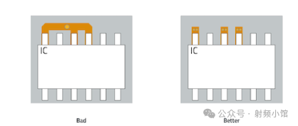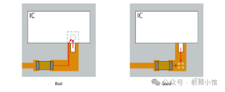在下面的不良示例中,我們看到兩個(gè)電路通過(guò)IC引腳布線,這可能會(huì)導(dǎo)致它們之間產(chǎn)生不必要的耦合。這可以通過(guò)使用星形結(jié)構(gòu)的獨(dú)立電流路徑和增加多個(gè)過(guò)孔來(lái)創(chuàng)建短環(huán)路進(jìn)行改進(jìn)。