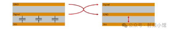 將信號(hào)層夾在GND和VCC之間會(huì)導(dǎo)致電容耦合。電源上的更高干擾信號(hào)水平會(huì)耦合到信號(hào)位置。紋波電壓、負(fù)載跳變等會(huì)在信號(hào)層上產(chǎn)生干擾電壓。將GND放置在信號(hào)層和VCC之間可以起到屏蔽作用,高頻噪聲會(huì)被直接分流到地。(注意GND需要低阻抗連接。)你可以將VCC和GND之間的距離減少到100微米或更小,以緊密耦合這些層。