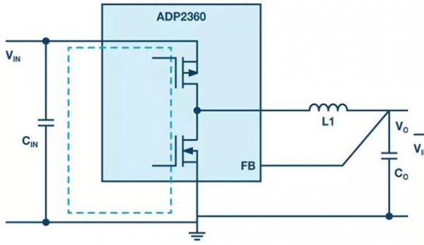 圖1.用于降壓轉(zhuǎn)換的開關(guān)穩(wěn)壓器(帶如虛線所示的關(guān)鍵熱回路)
