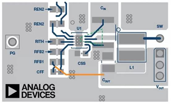 圖2所示為ADP2360的示例布局。在本圖中,圖1中的重要熱回路標(biāo)為綠色。從圖中可見,黃色反饋路徑離線圈L1有一定距離。它位于PCB的內(nèi)層。