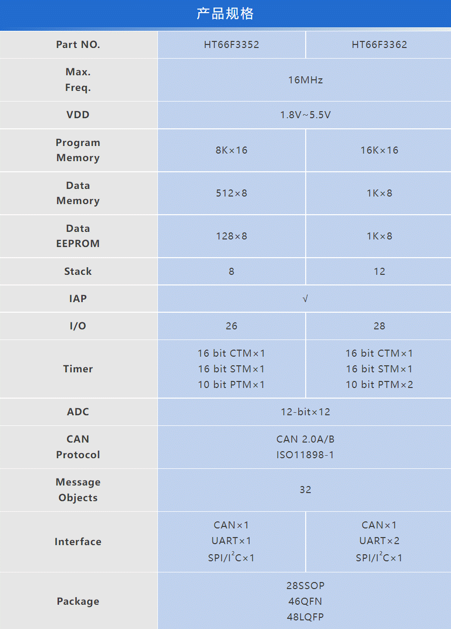 HT66F3352/HT66F3362系統(tǒng)資源最大16K×16 Flash程序存儲器、1024×8 SRAM及1024×8 True EEPROM等核心規(guī)格,其他實(shí)用的周邊電路,包含多功能定時(shí)器模塊、12-bit ADC、比較器、IAP、SPI/I²C/UART通信接口,應(yīng)用溫度范圍-40℃~105℃。封裝提供28-pin SSOP、46-pin QFN、48-pin LQFP。