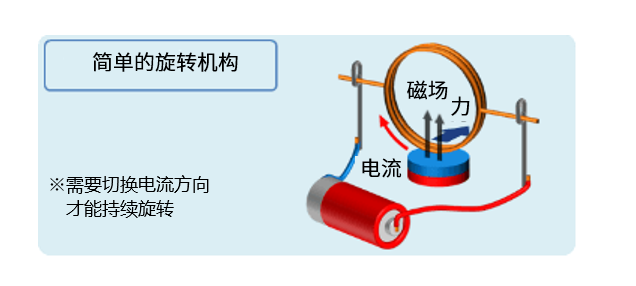 現(xiàn)在,相信您已經(jīng)明白了機(jī)械能是通過(guò)磁體的相吸與相斥的力而獲得的,那么,持續(xù)的旋轉(zhuǎn)運(yùn)動(dòng)是如何實(shí)現(xiàn)的呢?關(guān)于這一點(diǎn),只要看看無(wú)線遙控汽車和電子制作等作品中使用的電機(jī)的結(jié)構(gòu),其實(shí)很容易理解。