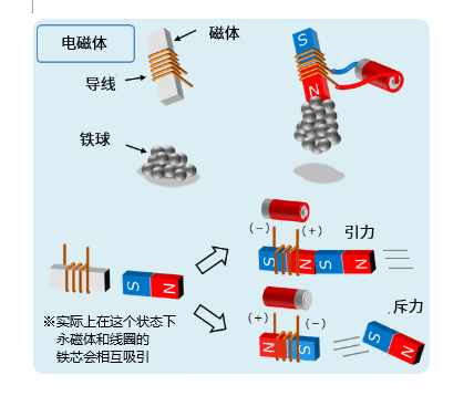電磁體是在鐵等磁性材料上纏繞導(dǎo)線而制成的。當(dāng)然,只是這樣纏繞并不會(huì)發(fā)生什么,但是當(dāng)電流流過(guò)導(dǎo)線時(shí),磁性材料就會(huì)擁有磁鐵的特性,會(huì)吸引其他磁體(鐵等)。另外,由于可以通過(guò)改變電流的方向來(lái)改變磁極,因此如果在一個(gè)磁體的對(duì)面配置另一個(gè)磁體,那么施加在該磁體上的力就可以在引力和斥力之間切換(參見(jiàn)下圖)。