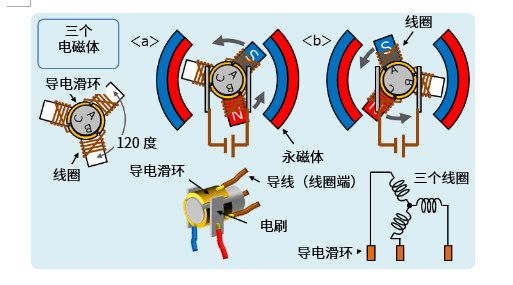 這種電機(jī)的結(jié)構(gòu)如“三個(gè)電磁體”圖所示,由以120度的間隔機(jī)械排列的線圈和導(dǎo)電滑環(huán)、夾著導(dǎo)電滑環(huán)配置的兩個(gè)電刷、以及永磁體組成。這種電機(jī)由于具有電刷而被稱為“有刷電機(jī)”、“換向器電機(jī)”或“整流子電機(jī)”。