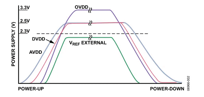 該ADC的問題與基準(zhǔn)電壓有關(guān),它必須小于AVDD + 0.3 V。因此,AVDD必須先于基準(zhǔn)電壓或與之同時上電。