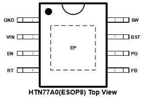 HTN77A0允許從高輸入電壓到低輸出電壓的功率轉換,開關MOS的最小導通時間為50ns。該器件提供3ms的固定軟啟動,以防止啟動過程中的涌入電流。HTN77A0具有外部環(huán)路補償功能,可靈活優(yōu)化環(huán)路穩(wěn)定性或環(huán)路響應。 HTN77A0提供谷值電流限制、峰值電流限值、熱關斷保護和輸入電壓欠壓保護。該器件采用ESOP8封裝。