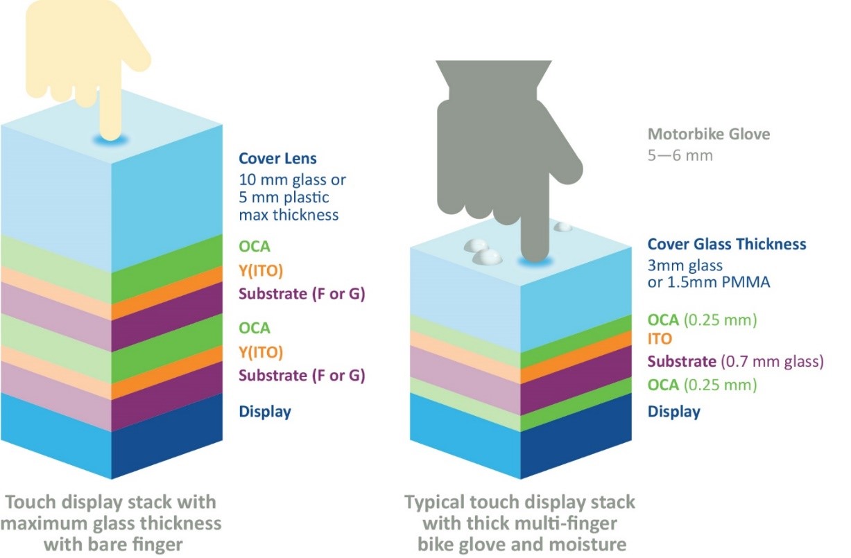 兩輪電動車的觸摸屏經(jīng)常暴露在惡劣的戶外環(huán)境中,容易受到雨雪、灰塵或泥沙等的侵襲。在氣候炎熱的地區(qū),兩輪電動車有時會停放在有陽光直射的地方,受到強烈的紫外線和紅外線照射。此外,它們還容易發(fā)生事故或遭到人為破壞?紤]到這些因素,兩輪電動車適合采用IP65/68防護等級的觸摸屏和厚蓋板玻璃,以保護下方的觸摸傳感器和LCD或OLED顯示元件。為防止陽光和紫外線照射,需要采用紫外線/紅外線過濾器,同時還要應用防反射/防眩光涂層來提高所有照明條件下顯示屏的可視性。因此,顯示屏疊層需要很厚的分層設計,每增加一層,都會使手指與電容式觸摸傳感器的距離更遠。距離越遠,就越難以準確檢測屏幕表面的觸摸操作。