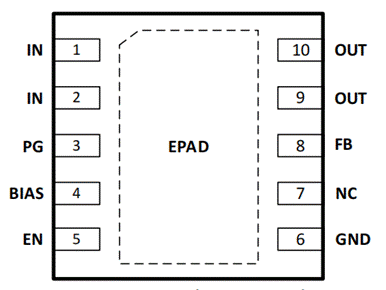 主電源路徑通過VIN,可連接至僅高于輸出電壓的值低至 150mV 的電源。該器件使用一個(gè)用于為 LDO 的內(nèi)部電路供電的附加 VBIAS 電源軌,支持極低的輸入電壓。IN 和 BIAS 引腳分別消耗 6.8µA 和 26µA 的極低靜態(tài)電流。低 靜態(tài)電流和超低壓差特性有助于提高功耗敏感型應(yīng)用中解決方案的效率。例如:IN 引腳的電源電壓可以是高效直流/直流降壓穩(wěn)壓器的輸出,而 BIAS 引腳電源電壓可以是可再充電電池。