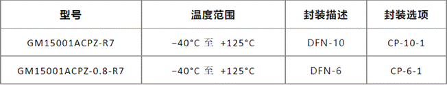 GM15001 采用小型 10 引腳 3mm × 3mm DFN 封裝,具備較低的熱阻,適用于對散熱要求高的應(yīng)用。同時(shí)還提供小型 6 引腳 2mm × 2mm DFN 封裝,適用于空間受限型應(yīng)用。