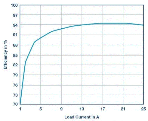 圖4顯示了不同負載電流下48 V輸入電壓和5 V輸出電壓的典型轉(zhuǎn)換效率。在大約6A時,轉(zhuǎn)換效率超過90%。在13 A和24 A之間, 效率甚至高于94%。