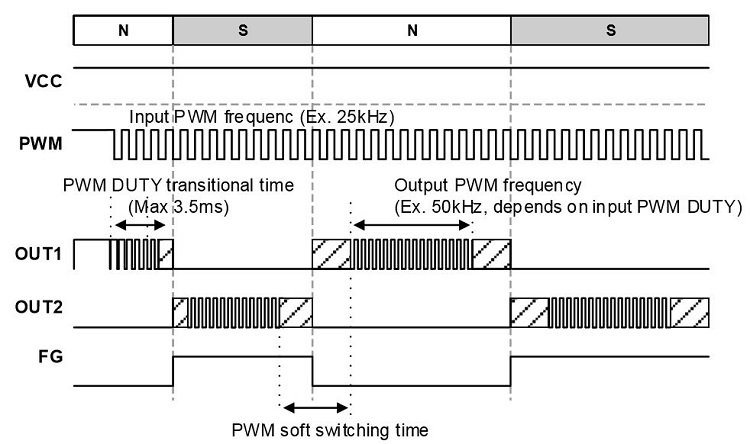 OUT1/OUT2 電機(jī)驅(qū)動信號的極性隨著檢測到的磁極性的變化而反轉(zhuǎn)。