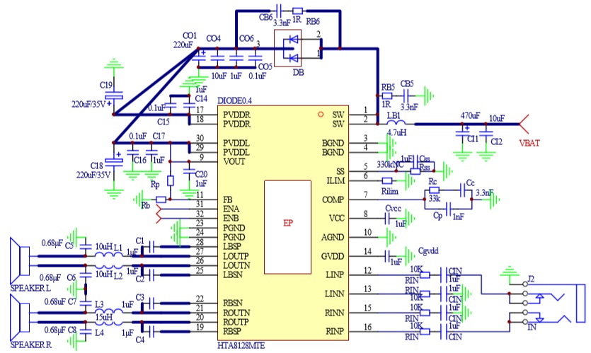 此外,HTA8128內(nèi)部集成免濾波器調(diào)制技術(shù), 能夠直接驅(qū)動揚(yáng)聲器,內(nèi)置的關(guān)斷功能使待機(jī)電流最小化,還集成了輸出端過流保護(hù)、片內(nèi)過溫保護(hù)、輸入電源欠壓異常保護(hù)、升壓電壓過壓保護(hù)等功能。