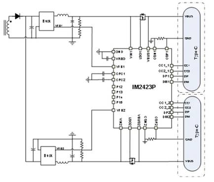 芯片內(nèi)置Flash,支持在線升級(jí);同時(shí)內(nèi)置FB直驅(qū)電路、2路P-Mos驅(qū)動(dòng)、VIN/VBUS電壓泄放通路;4個(gè)GPIO,支持 IIC,UART等,進(jìn)一步優(yōu)化外圍設(shè)計(jì)電路。IM2423P引腳高耐壓,其中CC Pin耐壓達(dá)30V,同時(shí)具有CC OVP,DP/DM OVP, OCP, OTP等多種保護(hù),可靠性更高。