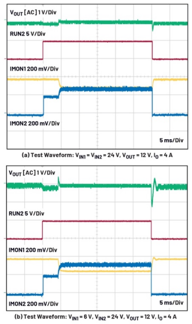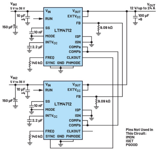 LTM4712支持需要冗余輸入的應(yīng)用。它可用于需要備用電源的系統(tǒng),或是那些從不同輸入源獲取電源以支持公共負(fù)載的系統(tǒng)。圖5顯示了一個(gè)示例電路,其中的兩個(gè)模塊由不同輸入(VIN1和VIN2)供電,共同為24 A負(fù)載提供12 V輸出。值得注意的是,任一輸入電壓下降都不會(huì)影響輸出調(diào)節(jié),而且通過(guò)連接COMP引腳,峰值電感均流作用始終有效。