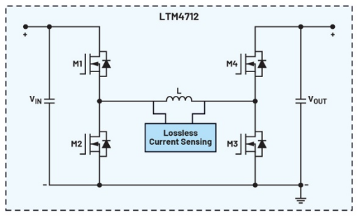 2023年,ADI發(fā)布了新款大電流、四開(kāi)關(guān)降壓-升壓穩(wěn)壓器LTM4712。這是一款36 VIN(最大值)、12 A功率模塊,采用高密度16 mm × 16 mm × 8.34 mm BGA封裝。它采用ADI專(zhuān)有的先進(jìn)組件封裝技術(shù),將高性能功率電感集成到封裝中。圖3顯示了該模塊中集成的專(zhuān)有電流檢測(cè)方案。這不僅節(jié)省了空間,而且還有效減少了額外的功率損耗。該器件采用先進(jìn)的降壓-升壓控制器和高級(jí)ADI封裝,能夠在寬輸入輸出電壓范圍內(nèi)實(shí)現(xiàn)超高的功率水平、功率密度、效率和出色的熱性能。