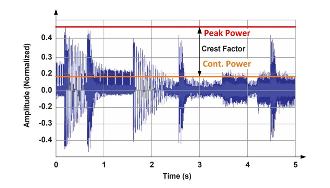 首先需要明確兩個(gè)術(shù)語:峰值功率和連續(xù)功率。峰值功率是最大瞬時(shí)音頻功率。它將決定電源可實(shí)際輸出的功率大小。連續(xù)功率是指一段時(shí)間內(nèi)的平均音頻功率。在電源設(shè)計(jì)中,連續(xù)功率是指系統(tǒng)在不超過元件溫度或平均電流額定值的情況下可以提供的特定輸出功率。圖 1 提供了峰值和連續(xù)音頻級(jí)別的示例。它們與波峰因數(shù)(波形的峰值與均方根 (RMS) 值之比的度量)有關(guān)。