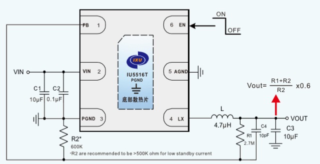 IU5516T是一款由基準(zhǔn)電壓源、振蕩電路、比較器、PWM/PFM控制電路等構(gòu)成的CMOS降壓DC/DC調(diào)整器。利用PWM/PFM自動切換控制電路達(dá)到可調(diào)占空比,具有全輸入電壓范圍(2.0V-5.5V)內(nèi)的低紋波、高效率和大輸出電流等特點。當(dāng)Vin-Vout(設(shè)置)<0.1V時,直至Vin小于設(shè)置的Vout值,此時IU5516T進(jìn)入直通模式,Vout輸出值跟隨Vin值。