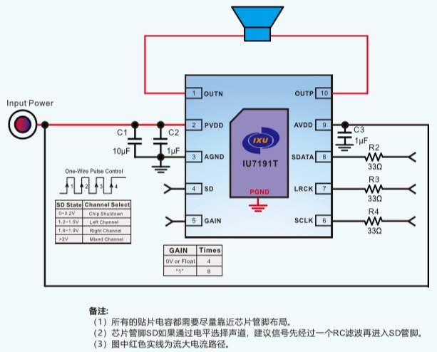 IU7191T為單聲道音頻功放。但通過SD管腳設(shè)置不同的電平或者一線脈沖輸入,這兩種方式可以進(jìn)行左/右/混合三種聲道的選擇。因此可同時選用兩顆芯片,靈活地組成立體聲產(chǎn)品。