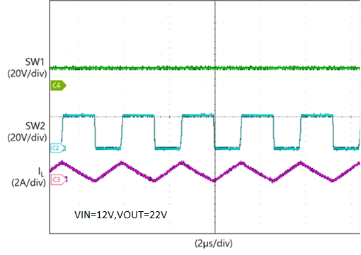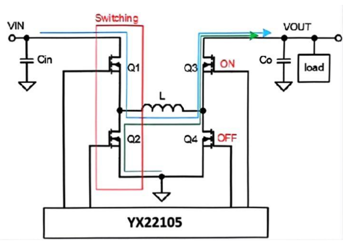 YX22105 能夠根據(jù)輸入輸出電壓自適應(yīng)的進(jìn)入降壓,升壓,升降壓模式;同時保證模式切換時具有優(yōu)異的暫態(tài)性能,使輸出的過沖、跌落風(fēng)險(xiǎn)降到最低。