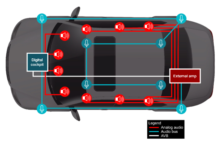 過(guò)去,高端汽車音響系統(tǒng)中的數(shù)字放大器采用分布式架構(gòu)進(jìn)行音頻處理,由單獨(dú)的 MCU、數(shù)字信號(hào)處理器 (DSP) 和網(wǎng)絡(luò)集成電路 (IC) 處理不同的任務(wù)。雖然這種分立式方法通常提供了設(shè)計(jì)靈活性,但也增加了系統(tǒng)復(fù)雜性、成本和尺寸。為了增加沉浸式環(huán)繞聲和道路噪聲消除 (RNC) 以提供家庭影院般的體驗(yàn),同時(shí)優(yōu)化燃油和能源效率,需要增加元件、音頻通道和軟件類型的數(shù)量。圖 1 展示了現(xiàn)代車輛中的音響系統(tǒng)示例,其中包含用于環(huán)繞聲的多個(gè)揚(yáng)聲器和用于 RNC 的麥克風(fēng)。