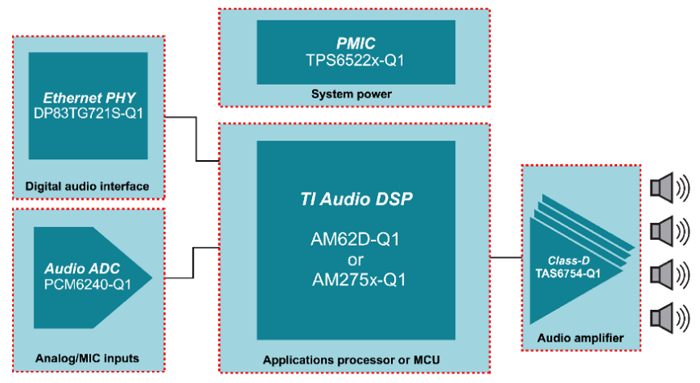 嵌入式處理器更高的器件集成度有助于簡(jiǎn)化音響系統(tǒng)設(shè)計(jì)。例如,AM62D-Q1 處理器和 AM275x-Q1 MCU 高度集成的汽車級(jí) SoC 采用 TI 的 C7x DSP 內(nèi)核、存儲(chǔ)器和元件,旨在幫助您通過(guò)單個(gè)器件滿足外部功能安全要求、信息安全要求和音頻網(wǎng)絡(luò)要求。