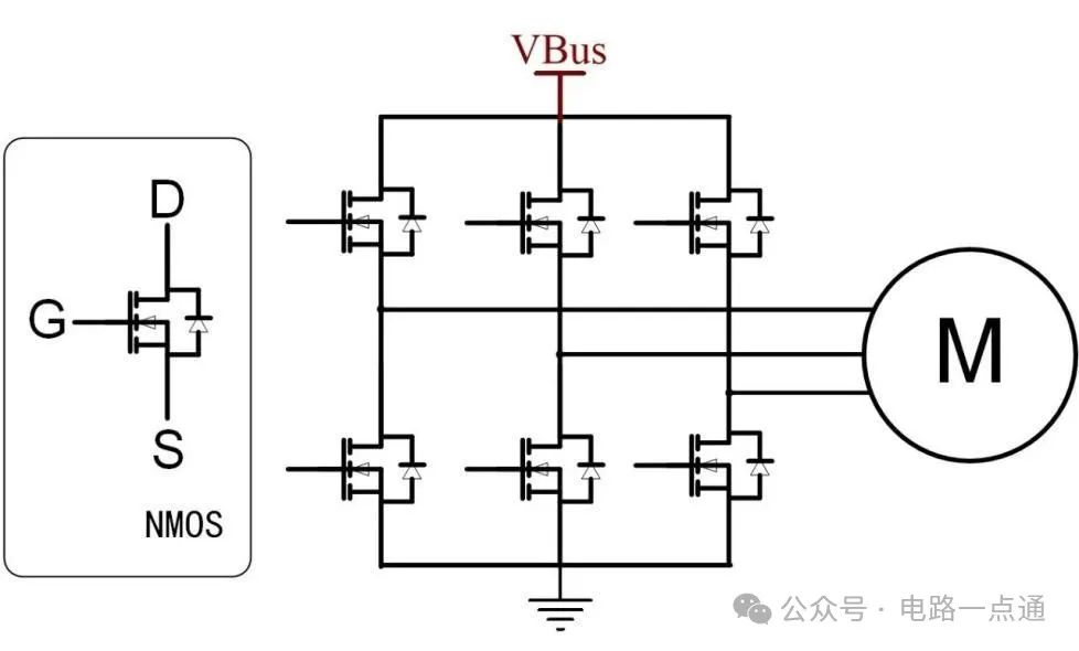 BLDC 的功率級驅(qū)動電路通常由 6 個(gè) N 溝道功率 MOS 管構(gòu)成三相全橋。這 6 個(gè) MOS 管分為兩組,三個(gè)高邊 MOS 連接電源正極(VBus),三個(gè)低邊 MOS 連接電源負(fù)極。通過控制 MOS 管通斷,實(shí)現(xiàn)電流在電機(jī)繞組中分配,推動電機(jī)運(yùn)轉(zhuǎn)。