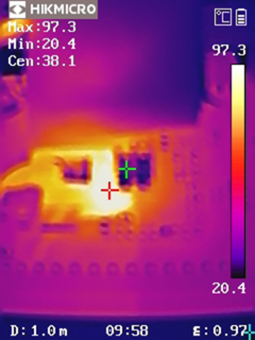 從熱成像圖可以看出,DEMO板在高負(fù)載條件下,溫度分布均勻,沒(méi)有局部過(guò)熱現(xiàn)象。在VIN = 24V, VOUT = 12V, IOUT = 10A 的條件下,最高溫度點(diǎn)為82.2℃,在 VIN = 48V, VOUT = 12V, IOUT = 10A 的條件下,最高溫度點(diǎn)為97.3℃