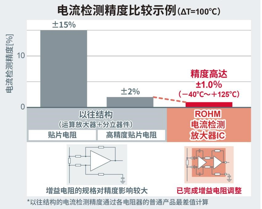 新產(chǎn)品將以往運(yùn)放+分立器件的運(yùn)放電路方式進(jìn)行一體化封裝,更加節(jié)省空間,僅通過連接分流電阻器即可進(jìn)行電流檢測(cè)。另外,新產(chǎn)品采用兩級(jí)放大器結(jié)構(gòu),輸入級(jí)采用斬波放大器*3,后級(jí)采用自穩(wěn)零放大器*4,通過在IC內(nèi)部匹配決定增益精度的電阻,不僅可抑制溫度變化的影響,還可實(shí)現(xiàn)±1%的高精度且穩(wěn)定的電流檢測(cè)。