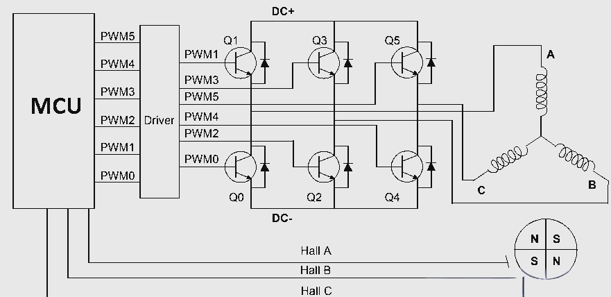 該驅(qū)動電路,常被稱作電子速度控制器系統(tǒng)或簡化為ESC,其中一種典型的配置為全橋驅(qū)動電路。它包含一個具備PWM輸出的MCU,以及為定子繞組三相服務(wù)的六個MOSFET。此外,霍爾傳感器的反饋和電源相關(guān)組件也是這一系統(tǒng)的重要組成部分。