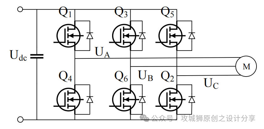 控制核心配合三相逆變器驅(qū)動:由6個MOSFET/IGBT開關構(gòu)成三相全橋控制。驅(qū)動回路圖如下