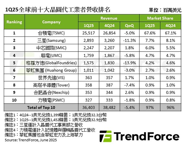 從廠商排名上看,臺(tái)積電以67.6%市占率穩(wěn)居第一,其晶圓出貨雖因智能手機(jī)備貨淡季而下滑,部分影響由穩(wěn)健的AI HPC需求和電視的關(guān)稅避險(xiǎn)急單抵銷,營收為255億美元,季減5%。 第二名的三星因美國先進(jìn)制程禁令限制中國大陸客戶投產(chǎn),以及其客戶組成關(guān)係,獲得中國大陸消費(fèi)補(bǔ)貼的紅利有限,第二季度營收季減11.3%,為28.9億美元,市占微減至7.7%。中芯國際受惠于客戶因應(yīng)美國關(guān)稅提前備貨,和中國大陸消費(fèi)補(bǔ)貼提前拉貨等因素,削弱ASP下滑的負(fù)面效應(yīng),營收季增1.8%,達(dá)22.5億美元,排名第三。另外,中國大陸晶圓代工廠華虹集團(tuán)以10.1億美元的營收排名第六,其旗下HHGrace新產(chǎn)能出貨貢獻(xiàn)營收,以及通過部分產(chǎn)品的低價(jià)策略吸引客戶投片,營收水準(zhǔn)大致與前季相同。合肥晶合第一季亦接獲客戶因應(yīng)美國關(guān)稅、中國補(bǔ)貼政策的急單,投片產(chǎn)出季增,帶動(dòng)營收增長2.6%,上升至3.53億美元,排名第九。