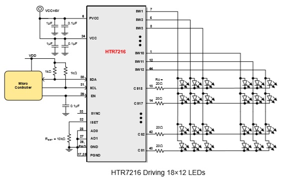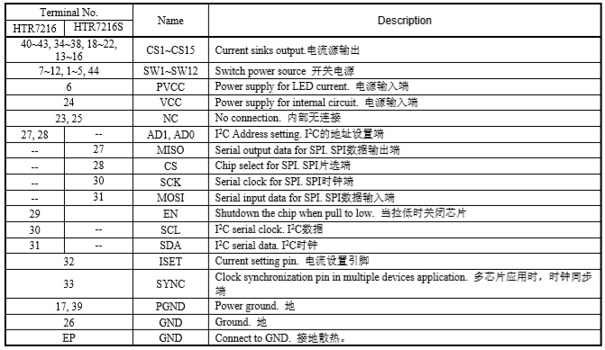 ・HTR7216:支持1MHz的I2C接口,16個I2C器件 地址
