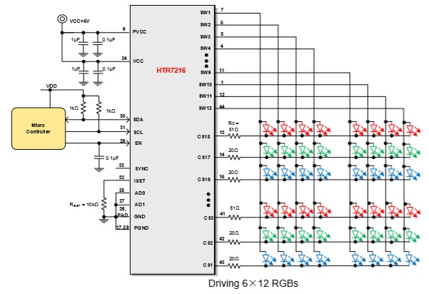 HTR7216(S)是一款通過1MHz的I2C接口 (HTR7216)或10MHz SPI接口(HTR7216S)進(jìn)行編程的支持18×12陣列的LED驅(qū)動芯片,每路SWx都支持8位PWM數(shù)據(jù)進(jìn)行獨立調(diào)光,并且每路CSx都有8位的直流掃描數(shù)據(jù)用來支持每個點的256階的線性PWM調(diào)光,并且每個CSx都支持256階的直流電流可調(diào)節(jié)等級。
