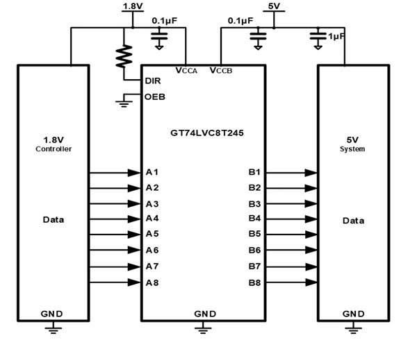 GT74LVCXTX45系列包括一路,二路,四路,八路和十六路收發(fā)器,是具有可配置電平轉(zhuǎn)換的雙電源總線收發(fā)器。最大傳輸速率可達到420Mbps,滿足高速數(shù)據(jù)傳輸要求。該收發(fā)器使用兩個獨立的電源軌,VCCA和VCCB的工作電壓范圍為1.65V至5.5V,支持寬電壓輸入。A端口參考VCCA,B端口參考VCCB,可以在1.8V、2.5V、3.3V和5.5V電壓節(jié)點之間實現(xiàn)通用低壓雙向轉(zhuǎn)換。具備VCC隔離特性,當(dāng)任一VCC輸入端處于接地狀態(tài),則所有輸入端均處于高阻抗?fàn)顟B(tài)。A端口和B端口的輸入電路始終處于激活狀態(tài),并具有邏輯高電平或邏輯低電平,以防止出現(xiàn)過多的ICC和ICCZ。GT74LVCXTX45的控制引腳由VCCA供電。該芯片的工作范圍為-40℃~125℃。