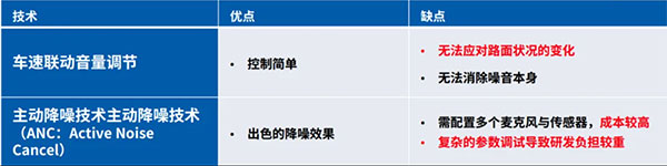 應(yīng)對音響環(huán)境變化,直接的方法就是用戶手動調(diào)節(jié)音量。然而,在持續(xù)變化的路面環(huán)境下頻繁調(diào)節(jié)音量,會很大程度影響用戶體驗(yàn)。針對這一問題,典型的現(xiàn)有技術(shù)——車速聯(lián)動音量調(diào)節(jié)和ANC雖對車內(nèi)音響控制有所貢獻(xiàn),但各自仍存在挑戰(zhàn)。