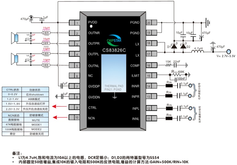 CS83826C內(nèi)置了過流保護,短路保護和過熱保護,有效的保護芯片在異常的工作條件下不被損壞。